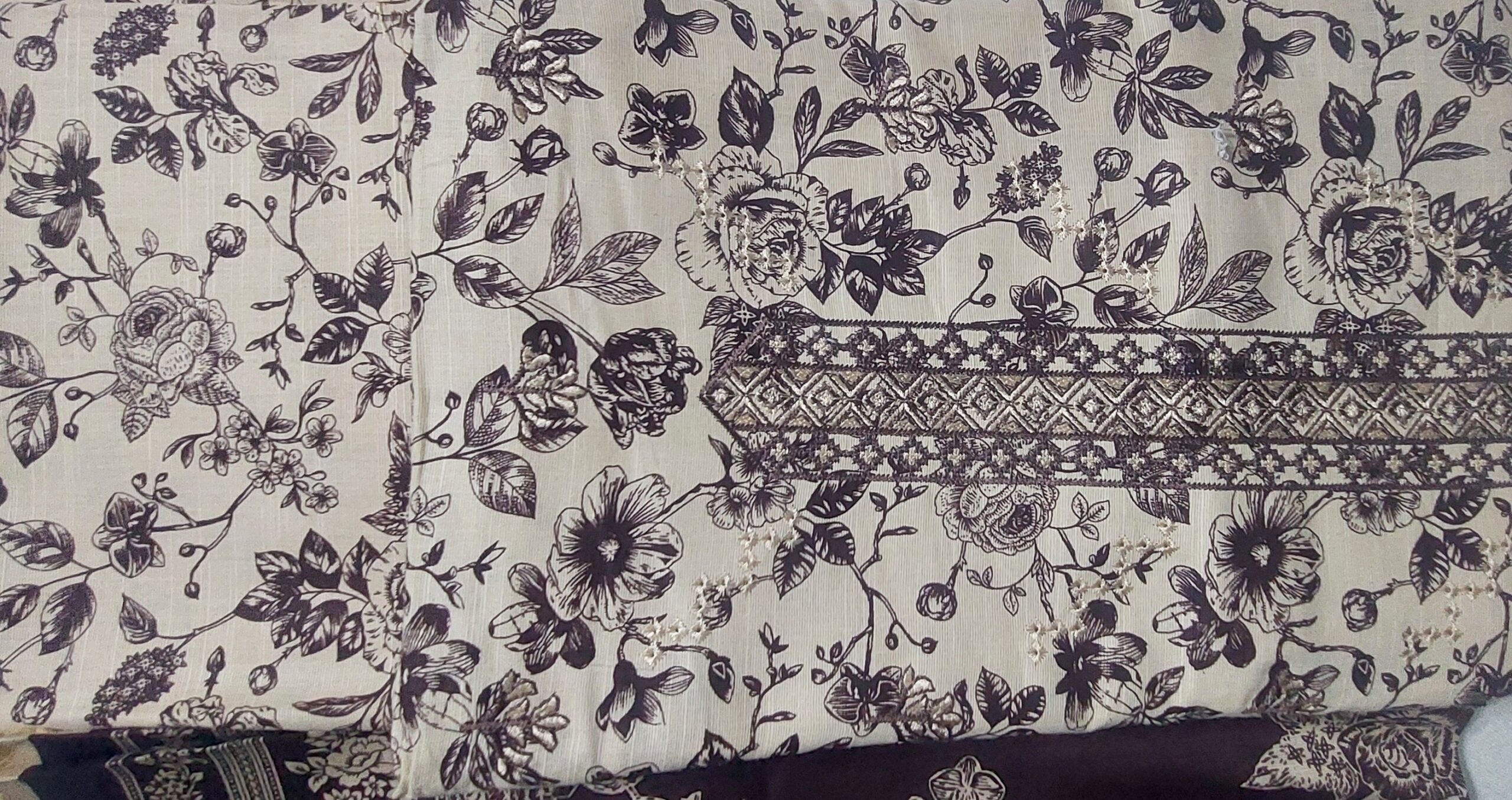Key Features:Two-Tone Design: The shirt fabric is a pale taupe/off-white with black/dark brown floral print and a central embroidered strip. The dupatta is a striking contrast: a darker black/maroon base with lighter floral prints.