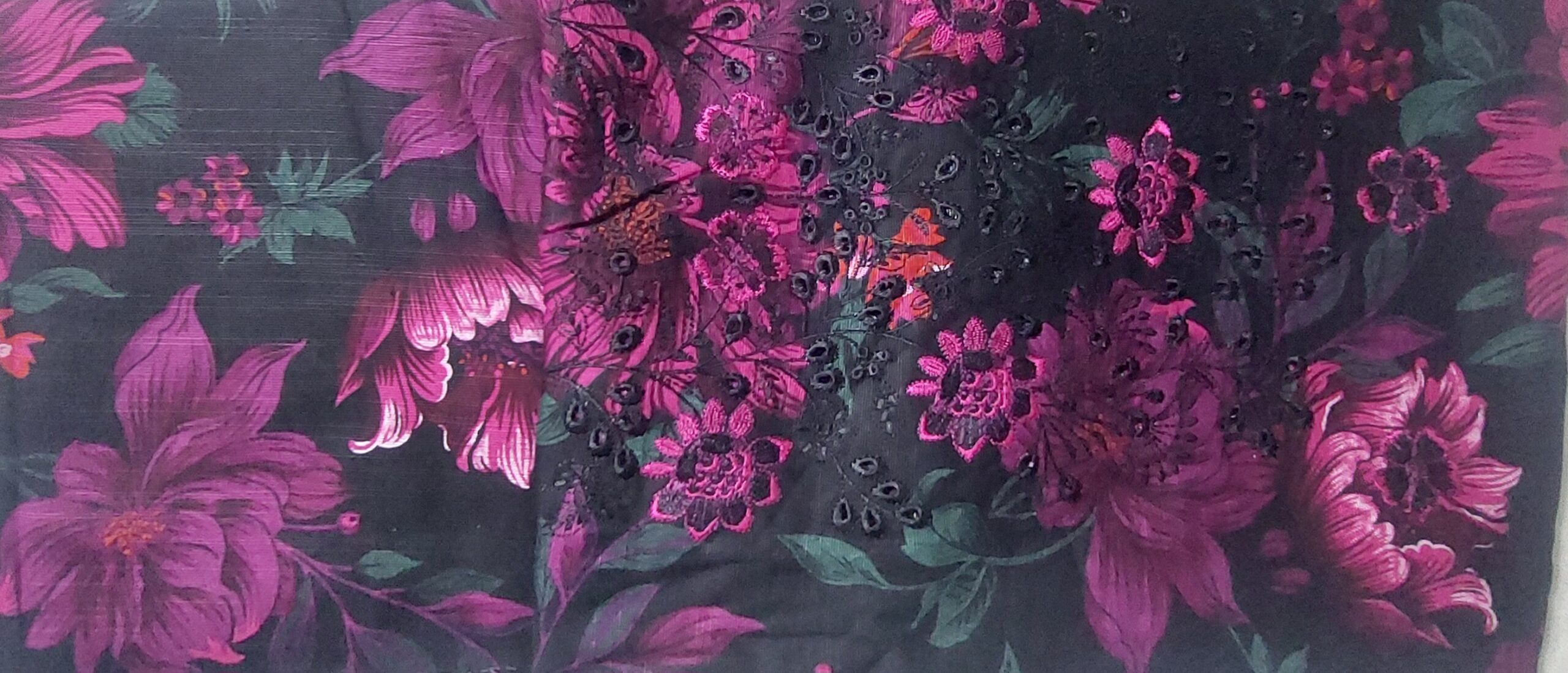 Color/Print: Dramatic black or very dark purple base with large, intense magenta/fuchsia florals.