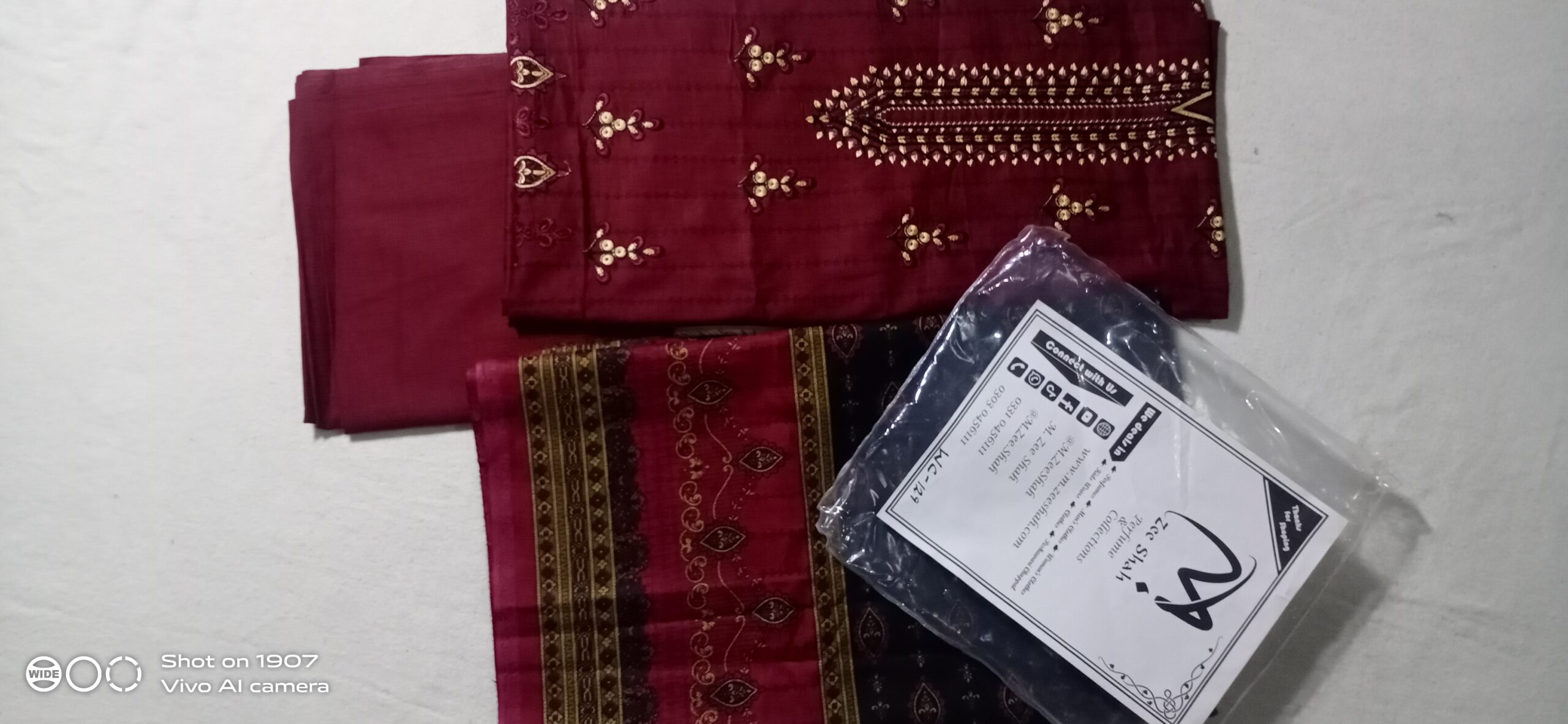 The embroidered Kameez fabric (top right).