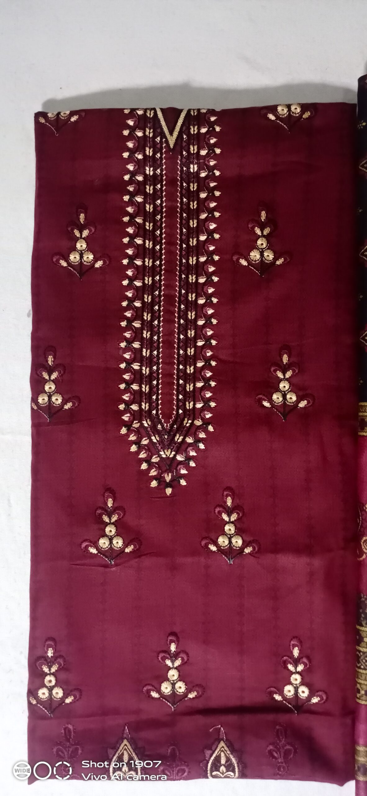 (The Shirt/Kameez Fabric): This is the main piece for the top. It features a deep maroon/burgundy base color with elaborate gold and black thread embroidery focused heavily on the neckline (yoke) and scattered across the front.