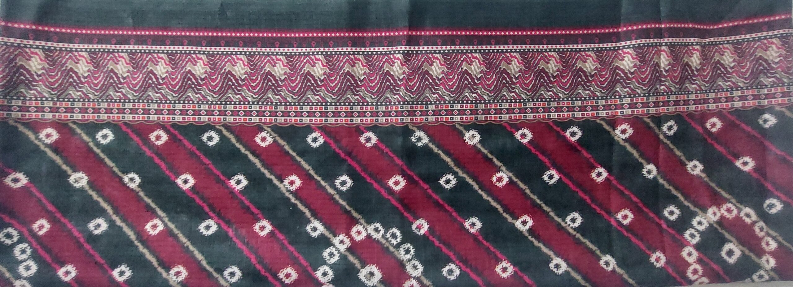 Dupatta/Shawl Piece… Black, Magenta, White in diagonal stripes: This is the standout feature! It has bold diagonal stripes in black and magenta with white square motifs, resembling an Ikat or Bandhani style print. This heavily printed piece is the Dupatta/Shawl.