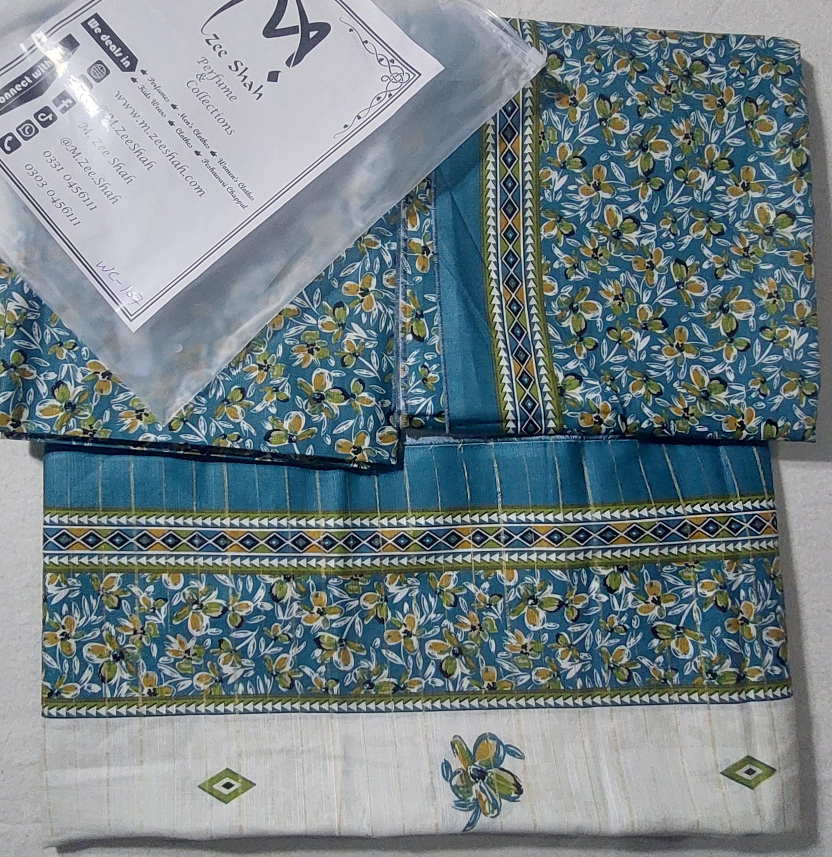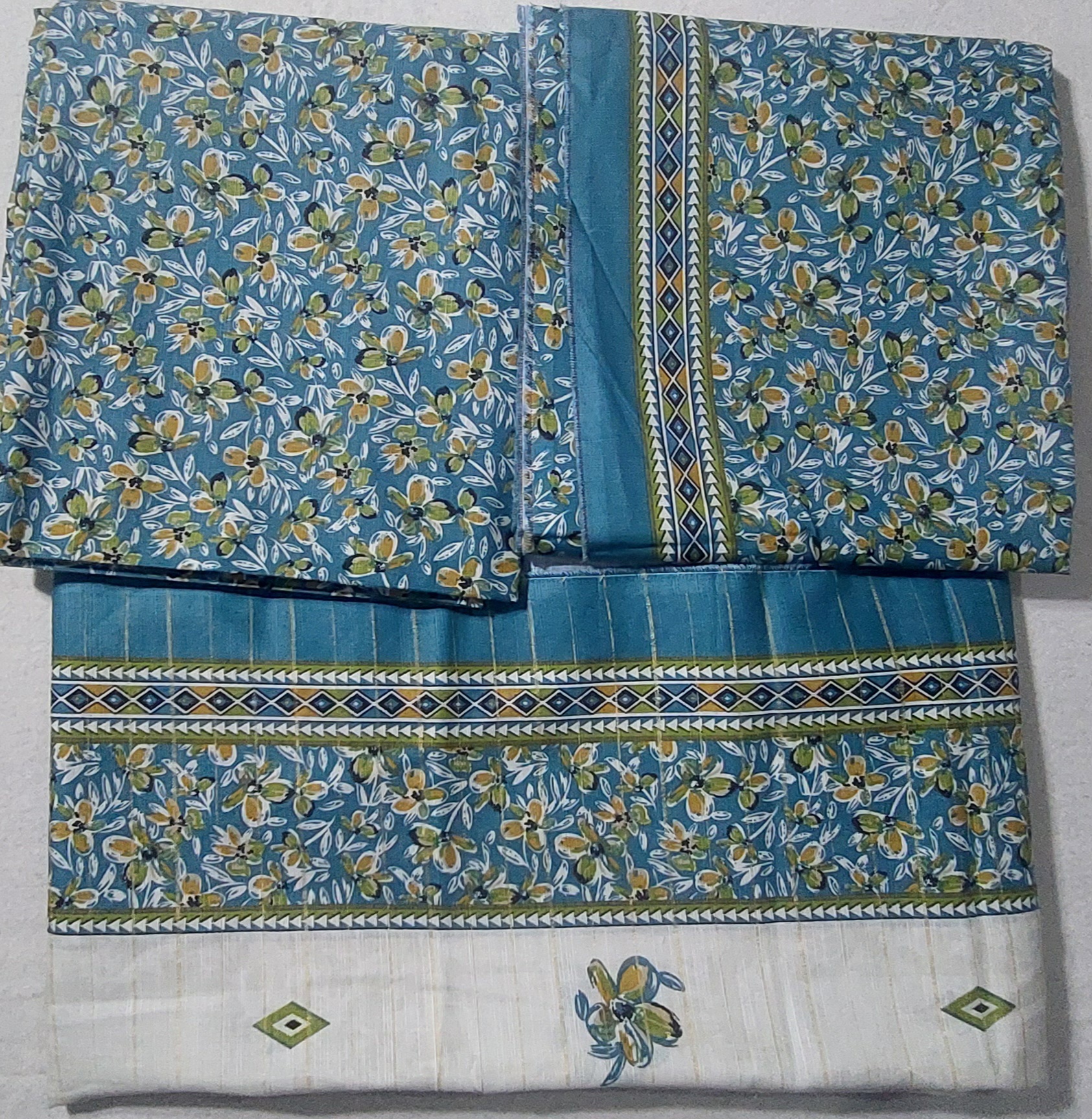 Dupatta/Shawl Piece… Teal, Blue, Yellow, & WhiteDupatta/Shawl Piece: This fabric is highly decorative. It consists of three main bands: a striped teal band, a geometric/floral printed band, and a wide plain white band at the end with scattered small motifs. This striking contrasting combination of prints and the plain white end confirm this is the Dupatta/Shawl.