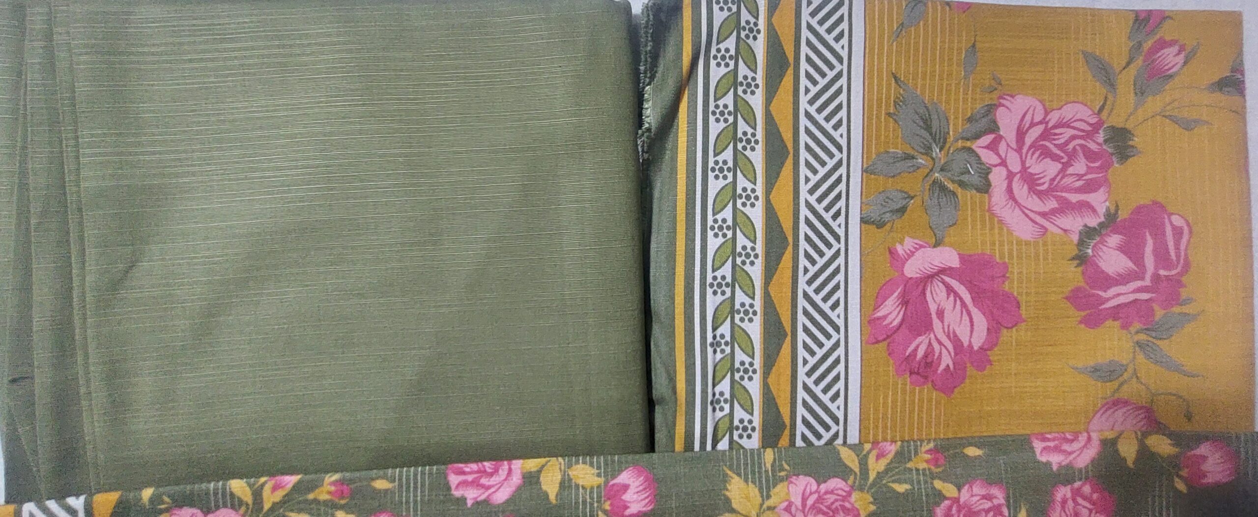 Trouser Piece… Solid Olive Green: This plain, solid fabric is the Trouser/Shalwar material. Its color matches the base tone of the prints.