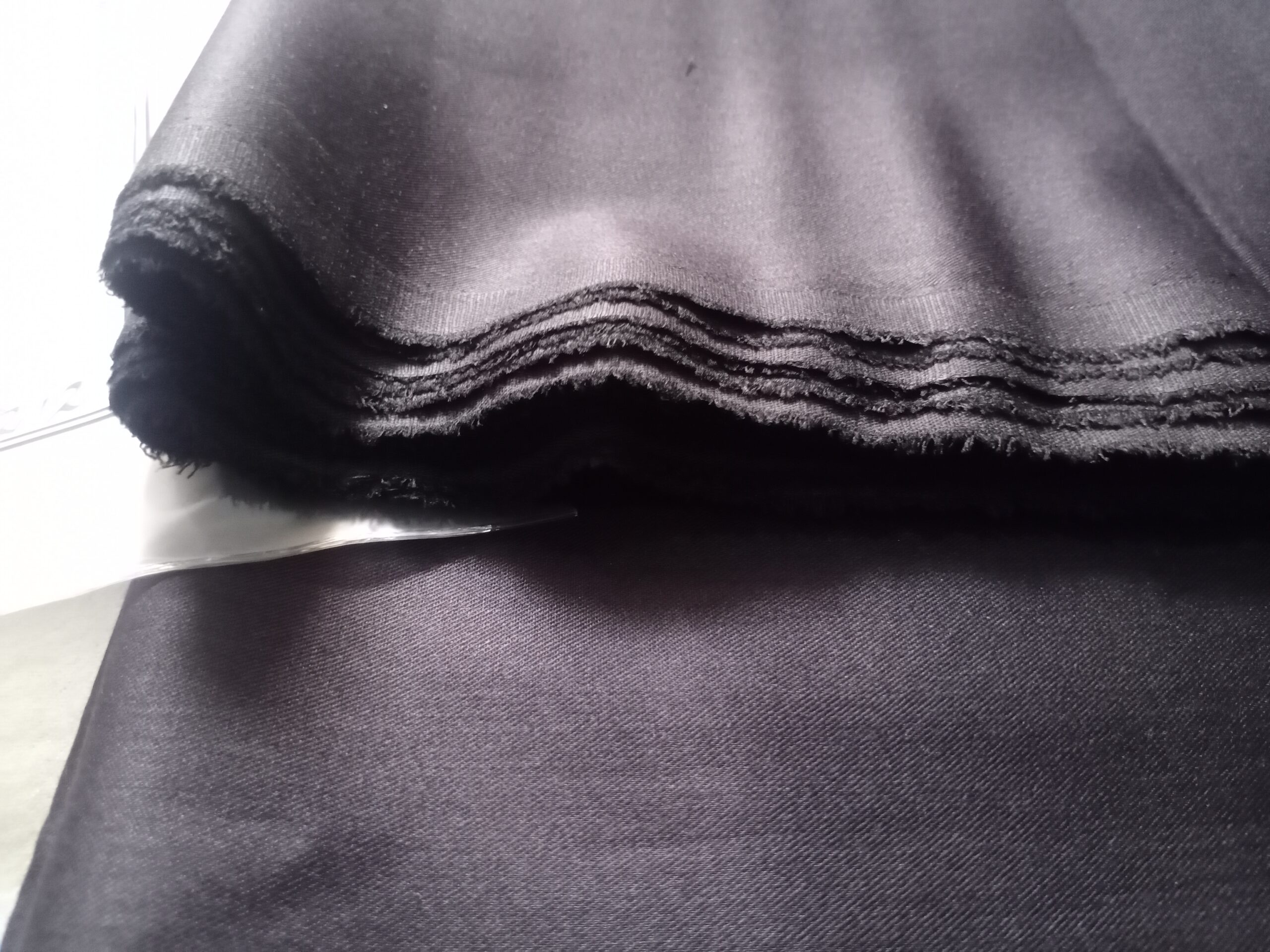 Sheen: Because the fabric is a twill weave (you can see the diagonal lines/ribs), it catches the light, giving the black color a noticeable luster or subtle sheen. This makes the fabric look polished and is characteristic of materials like gabardine or certain cotton twills.