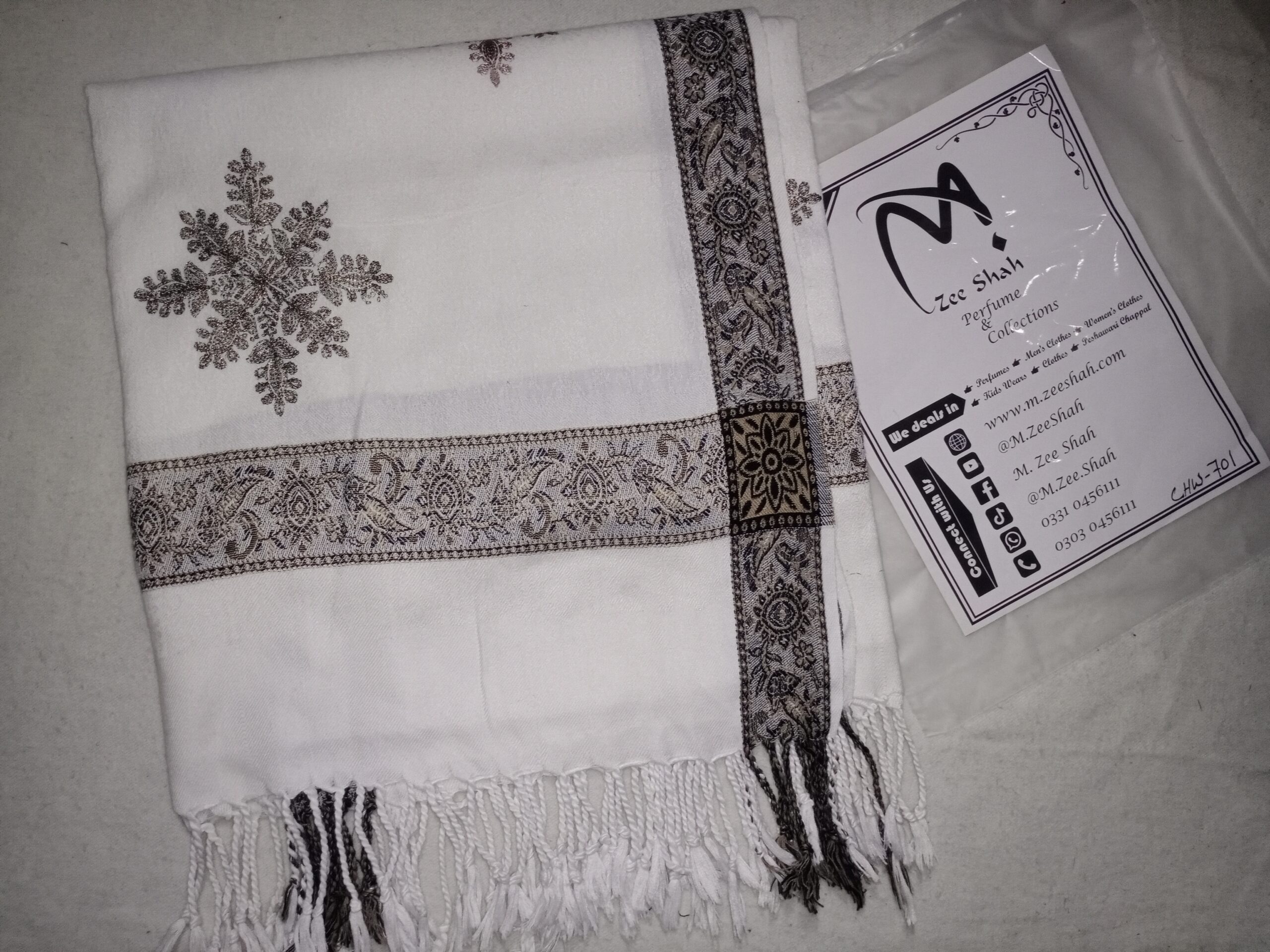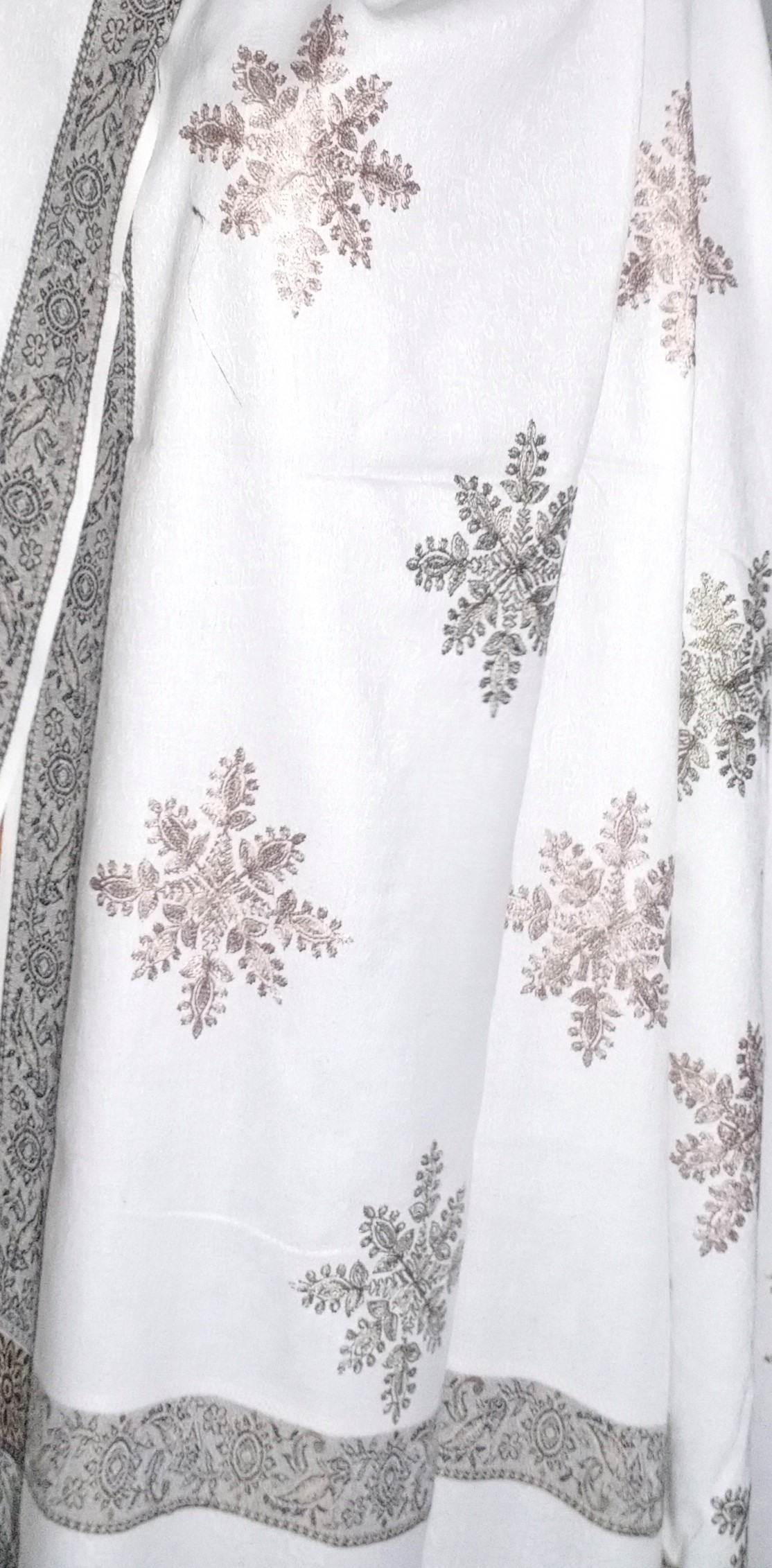 Fringe: It has a short, tied fringe (tassels) on the end visible, which is a classic finish for shawls.